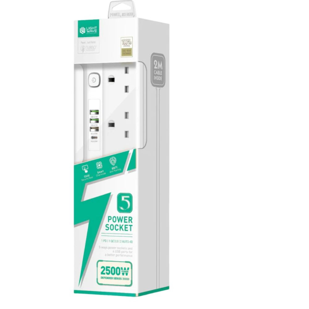 The Lightwave 5‑Way Extension Socket 2 Metres 4 USB – LW EXT 54U is a versatile and practical power accessory that combines five mains outlets with four USB charging ports in a compact 2 metre extension lead. It’s ideal for homes, offices, study desks, and entertainment areas where multiple devices need both mains power and USB charging from a single wall socket.