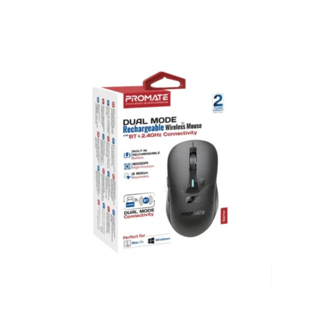 The Promate Samo Dual Mode Rechargeable Wireless Mouse is a versatile and ergonomic mouse that offers both Bluetooth and USB wireless connectivity, along with a built‑in rechargeable battery. Designed for productivity and convenience, it’s ideal for laptops, desktops, and mobile devices whether you’re working, studying, or browsing.